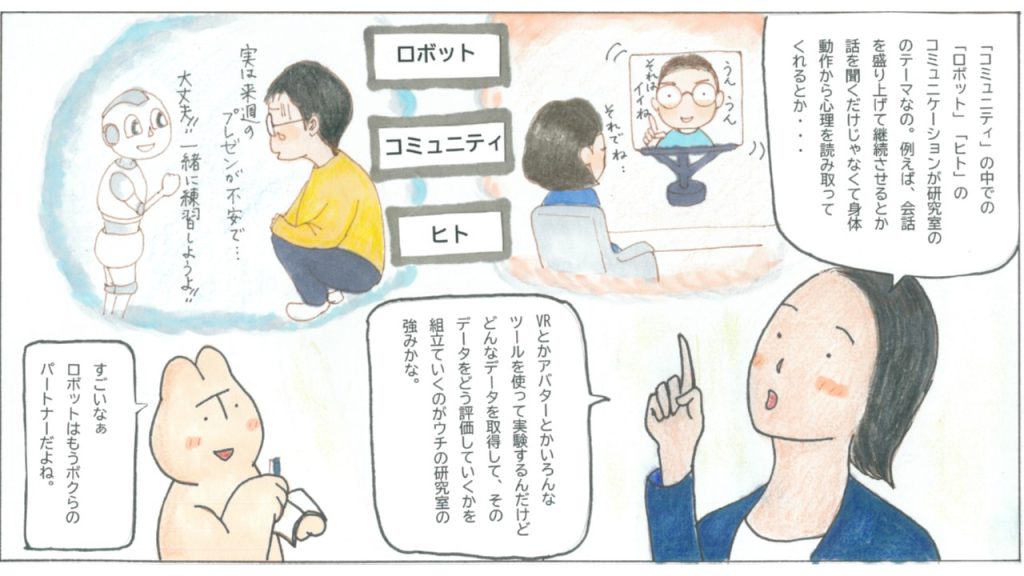 大学院生になると、人間とロボットの間で起こっている問題をはじめ、具体的な社会課題の解決に向けた研究に挑みます。自分なりに解決策を考え、実験計画の策定から実際の実験や検証、システムの修正、そして社会実装へと至る流れをプランニングします。例えば、コロナ禍で増えた遠隔でのコミュニケーションにおいて、会話を促進する雰囲気づくりに役立てようと、VR環境での感情の動向を推定する研究などがあります。最終的には、VR空間でのアバターや、現実空間でのロボットが会話をサポートするシステムの構築がゴールです。