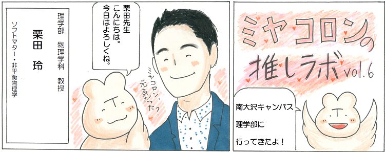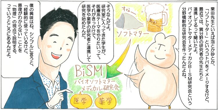 私の研究室では、砂や泡、液晶など、柔らかい性質を持つ「ソフトマター」を物理学の見地から研究しています。日常的に使用しているものの実は原理がよくわかっていない現象や、応用的な経験則に基づいて使用されている物質など、興味深い現象や物質があれば対象を限定せずに研究していきたいと考えています。例えば、泡で油汚れを落とす効率を上げる場合に、メーカーなどの研究開発の現場では、界面活性剤の合成や混合を試行錯誤します。私の研究室では油汚れを吸収する原理を明らかにし、そこから効率アップを図る研究を進めていくのです。
