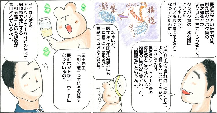 近年の研究で特徴的な動向といえば、医学分野へのアプローチです。医学界ではタンパク質のミクロな働きに着目する研究が広く行われていますが、私が物理学の立場から研究してきた「相分離」はタンパク質の研究にも役立ちます。相分離は1970年台から80年台にかけて、物理学分野で盛んに研究されたテーマ。当時、細胞内での現象が研究対象ではなかったものの、さまざまな理論が確立されています。細胞内はタンパク質の種類も多く、相互作用が複雑なため、そのまま現状の理論が使えるわけではありません。細胞内で起きていることをしっかり捉えて、再構築していく必要があります。そこで、医学や生物学の研究者とタイアップし、医学的な知見、生化学的な知見、物理学的な知見を合わせながら、進めていく必要があります。学医学的視点で見た時、ミクロな動きに限らず、多様な時間や長さのスケール感で現象を考察する必要がありますが、これはソフトマター研究が得意とするところでもあります。どの大きさの段階での分析が現象を理解するために最適であるかという「階層性」は、物理学で用いてきた概念であり、階層性を意識した研究の有用性は医学分野でも同様なのです。現在は相分離の研究者はかつてほど多くありませんが、私がその少ない専門家の一人として医学分野にアプローチする以上は、相分離や階層性に関する物理学のバックグラウンドを存分に活かしたいと考えています。