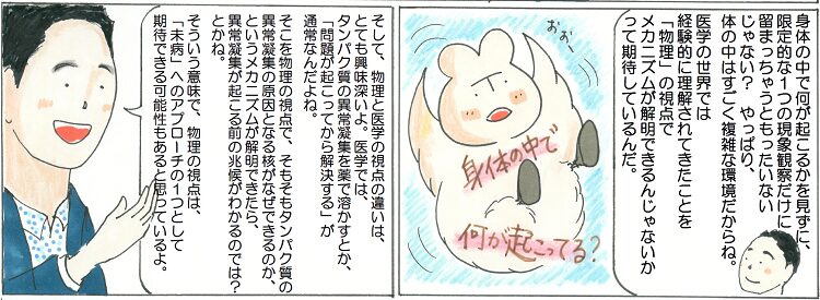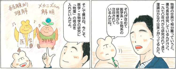 物理学では物事を単純化して理解しようと試みる傾向があり、有効なケースもあるのですが、人体は極めて複雑なもの。物理学の手法や尺度に固執すれば、本気で病気に向き合おうとする医学的な研究は全く進まないと思っています。物理学のバックグラウンドは活かすものの、物理学という枠組みを取り払い、謙虚に他分野と連携することが重要と考えています。現在、医学や薬学、生化学の研究者たちと一緒に、生命現象のメカニズムを解き明かそうと奮闘し、少しずつ成果が出始めています。