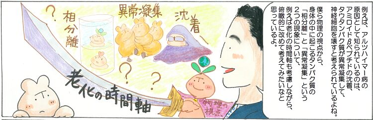 現在、具体的な研究対象としているのはアルツハイマー病です。専門的には、アミロイドβが蓄積され、その後にタウタンパク質の蓄積と異常凝集が進むことで、神経細胞が破壊されて発症すると考えられています。ただし、アミロイドβとタウタンパク質は、どちらも相分離するものの、相分離は単に集まって濃くなることであり、異常凝集は結合してしまう状態のこと。物理学では相分離と異常凝集は別の現象であって、異常凝集しなければ濃くなるだけです。濃くなるからといって異常凝集するわけでもなく、悪影響は起きないのですが、異常凝集すると解けずに大きくなり、神経細胞を破壊してしまうのです。同じ物質で相分離と異常凝集が起こるからといって、その間の因果関係については、より慎重な考察が必要です。因果関係の有無によって、異常凝集メカニズムへの解明アプローチが変わりますので、まず因果関係から調べたいと思っています。さらには、アルツハイマー病もパーキンソン病も加齢に伴って発症しますので、老化によって体内の何がどう変化して異常凝集が促進されるのかを明らかにしたいと考えています。将来的には、異常凝集のメカニズムを解明し、アルツハイマーの発症を回避する方法を提案したいと考えています。また、アルツハイマー病にとどまることなく、パーキンソン病をはじめとして、タンパク質の異常凝集が関わっている病気の予防に貢献することが理想です。