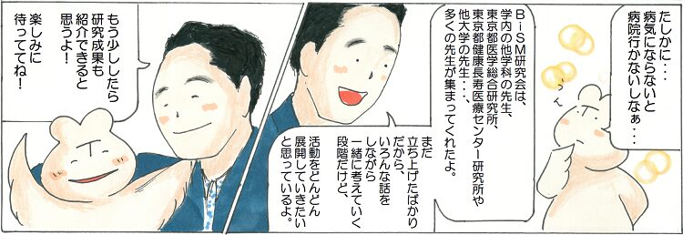 相分離の知見を医学領域に応用させようとしたきっかけは、研究室の学生の興味・関心です。ただ、私を含め、例えばタンパク質を抽出する医学や生物学的な手法については何の知識もなく、ゼロからのスタート。多分野との共同研究をとおして新たな技術や知見を身につけながら、「バイオソフトマターメディカル研究会」、通称BiSM(バイセム)と呼ぶ研究チームを立ち上げるに至りました。都立大を中心に、東京都医学総合研究所や東京都健康長寿医療センターのほか他大学の研究者とも連携しており、今後は東京都にも協力・支援を打診しながら活動していきたいと考えています。