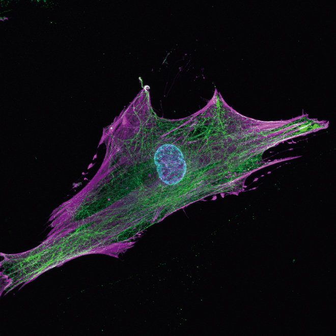 青色はDNA(細胞の核)、紫色と緑色は細胞骨格を示す。幹細胞はこの細胞骨格を通じて培養皿の硬さを感じ取る