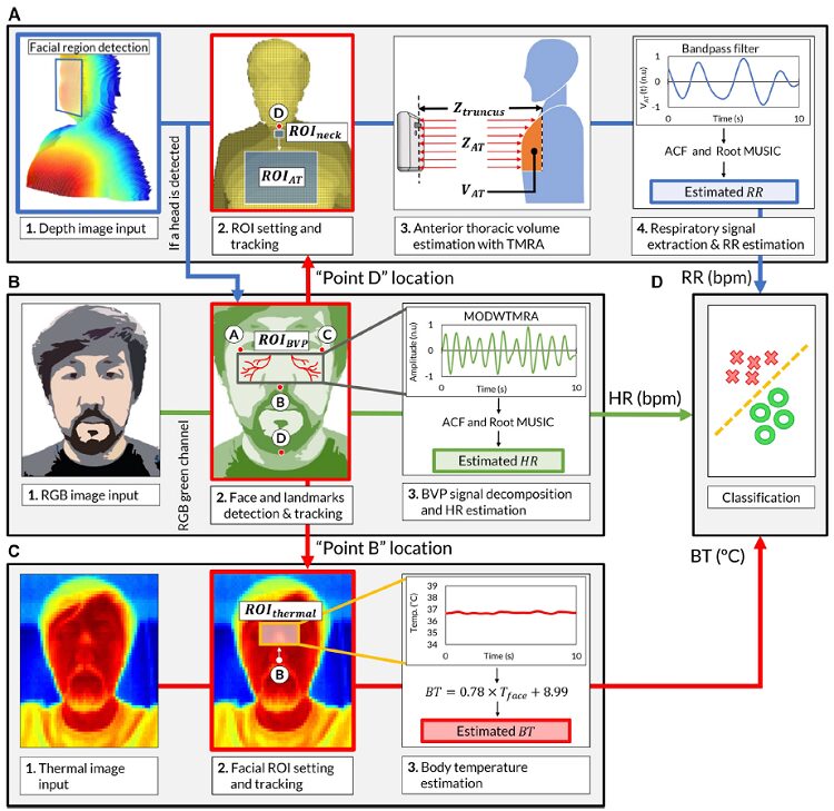 本研究では、RGBカメラ、深度カメラ及び赤外線カメラを備えたハードウェアと、それらカメラから得られる情報を分析して感染の有無を高精度に判別するシステムを開発しました。