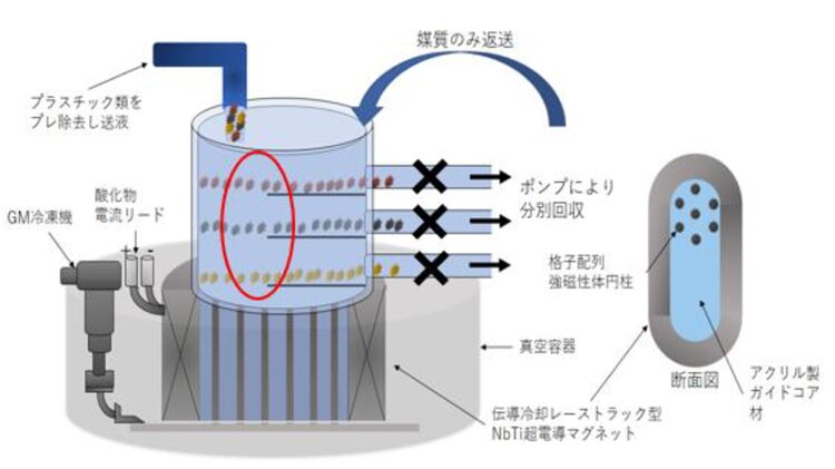 近年、都市鉱山という言葉があるように、各種家電製品や電子部品などに複数の有価金属が用いられており、それらの廃棄物の有価金属の再利用が求められています。現在では選別対象を粉砕し、回転式選別機や渦電流選別、電磁石や永久磁石などを用いた磁気力選別が行われていますが、低磁化率や高密度金属の分離は困難であったり、未だ人手による手動選別も行われています。一方、新たに検討されていた磁気アルキメデス効果を用いた分離システムでは、選別対象を磁気浮上させる磁場が電磁石内部のボア(筒)に限られ、分離物質の取り出しが困難でした。