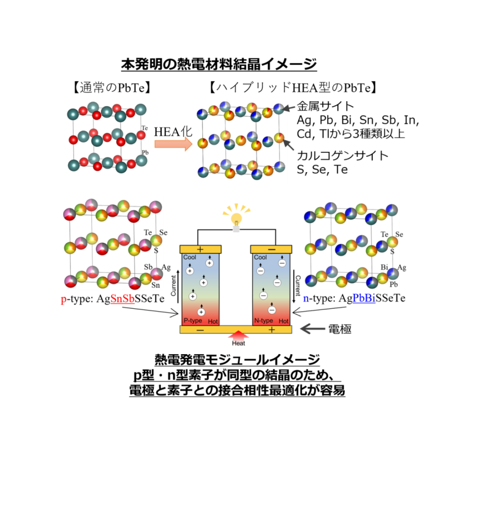 本発明ではNaCl型結晶のサイトに特定の元素を合計6種類以上含めることで、熱電材料の熱電変換効率を向上させることに成功しました。