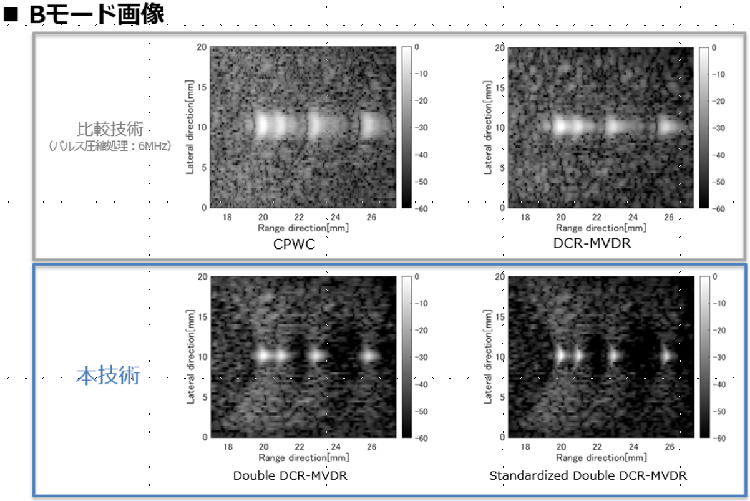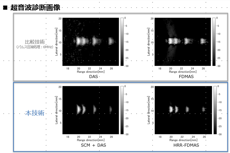 本技術は、新たに開発した各種の計算方法を適用することで、超音波可視化画像の分解能及び解像度を向上されることに成功しています。複数種類*の計算方法を開発しており、用途や状況に合わせた適用開発が期待されています。
